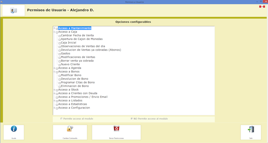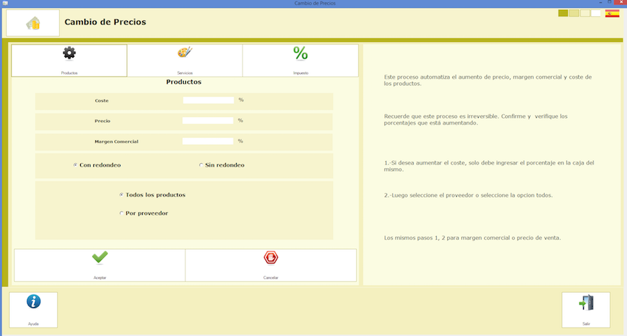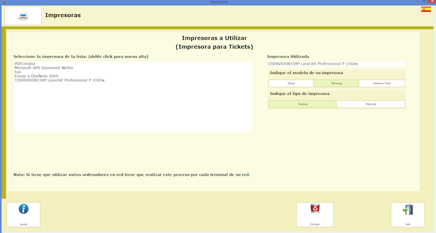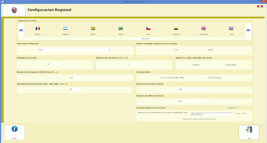 Permite, entre otras, modificar la configuración regional, el ticket de venta, el número de decimales y todo lo relacionado con el programa.