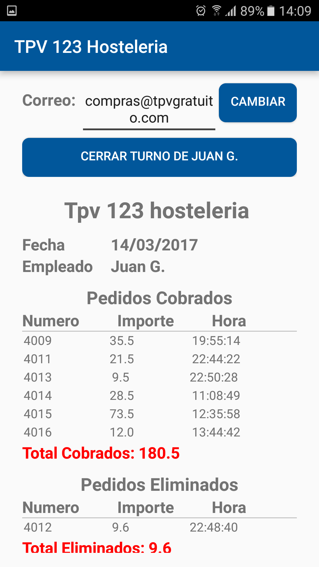 Cuando un camarero termina su jornada de trabajo podrá cerrar la caja desde su teléfono o Tablet Android y enviar al mail que configuremos este cierre de caja con sus totales. De esta formar el encargado o dueño estará enterado de los importes que se realiza en cada turno.