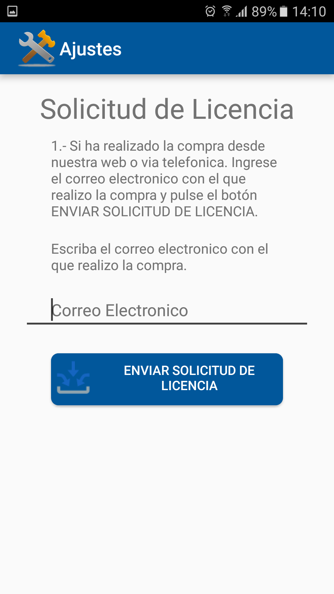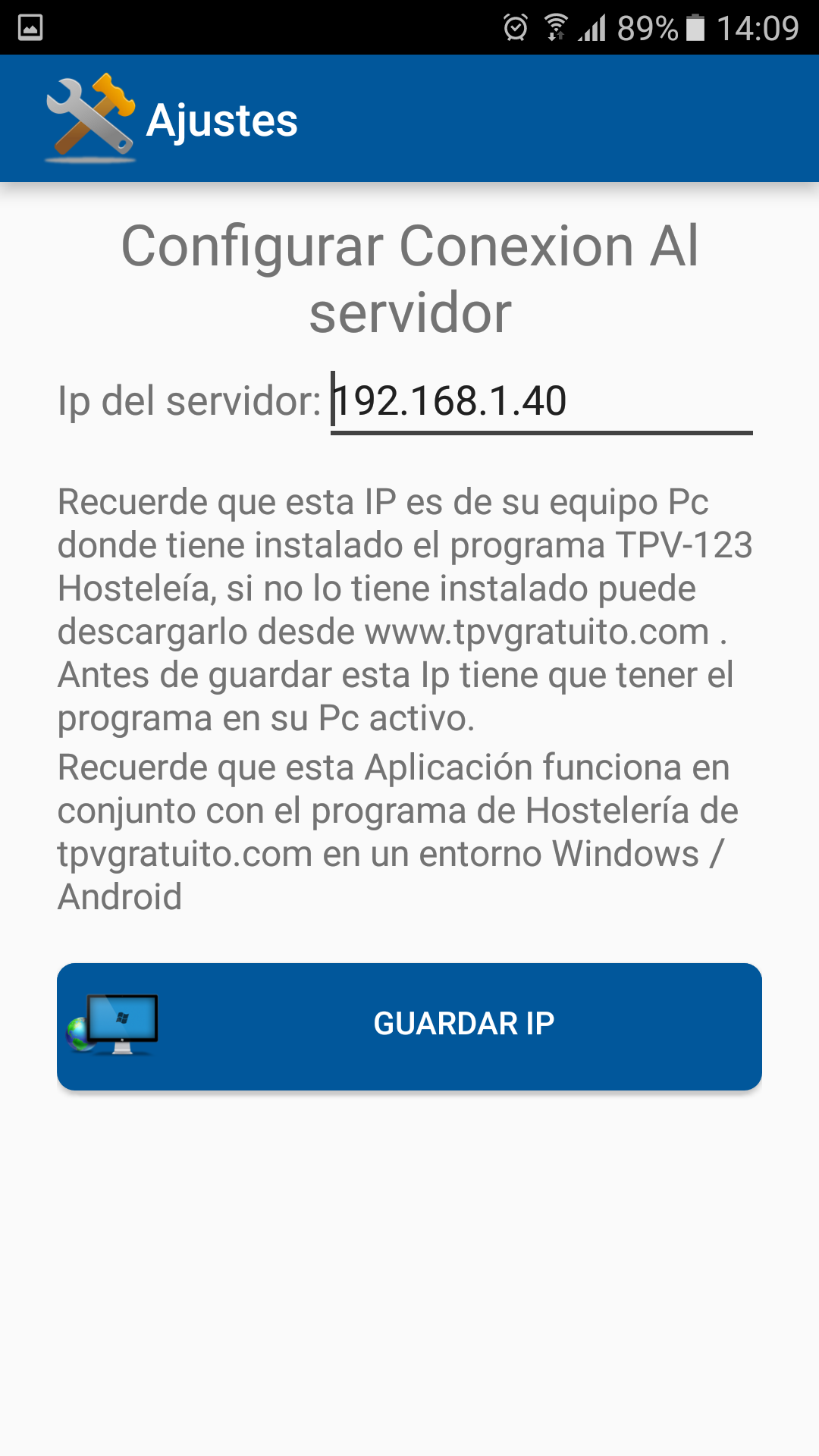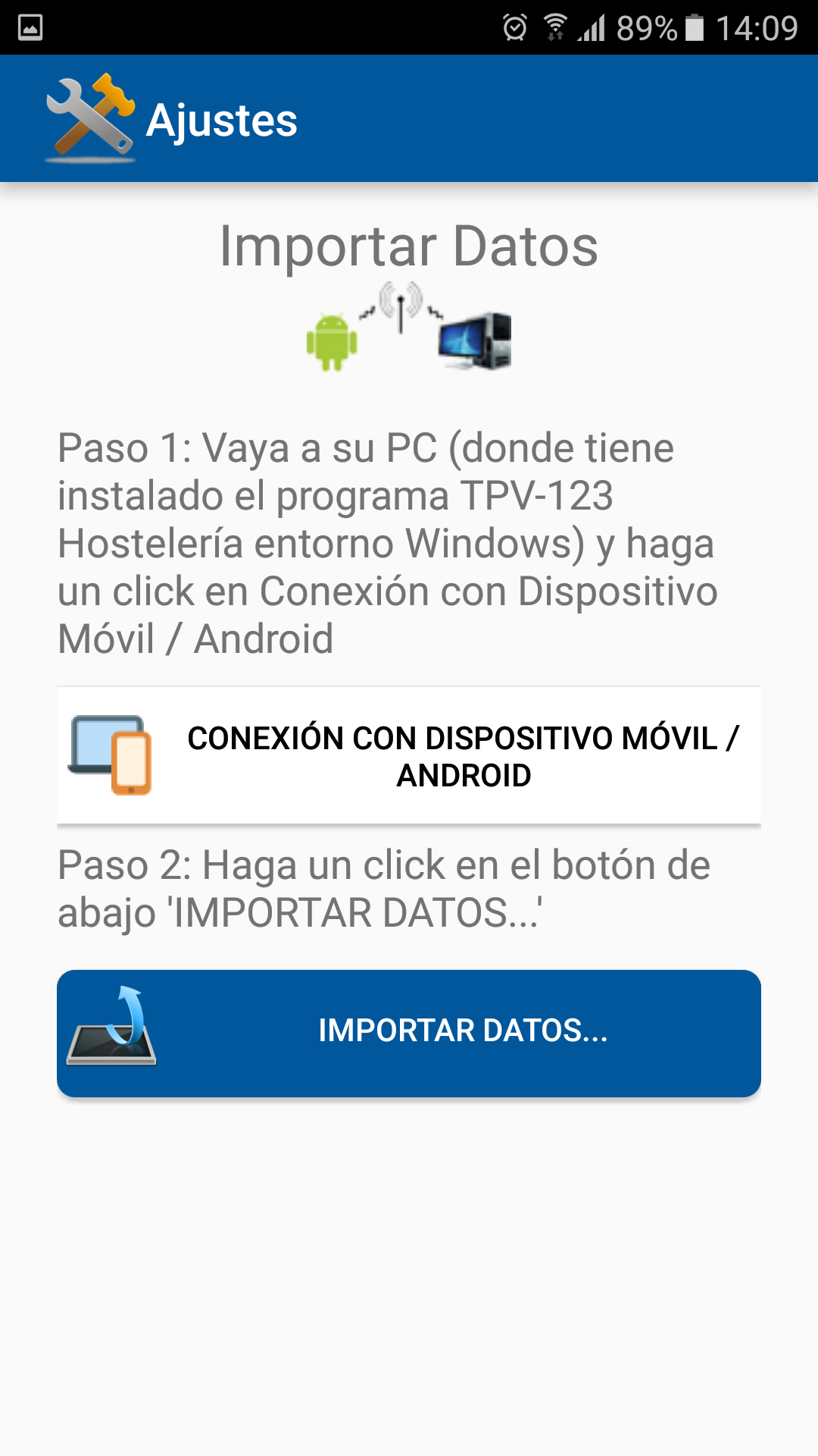 Terminal Android versión 4.1 o superior con conexión wifi al pc donde está instalado el programa. Terminal de 4.5”, 5.5”, 7”, 9.7” y 10“ de pantalla.