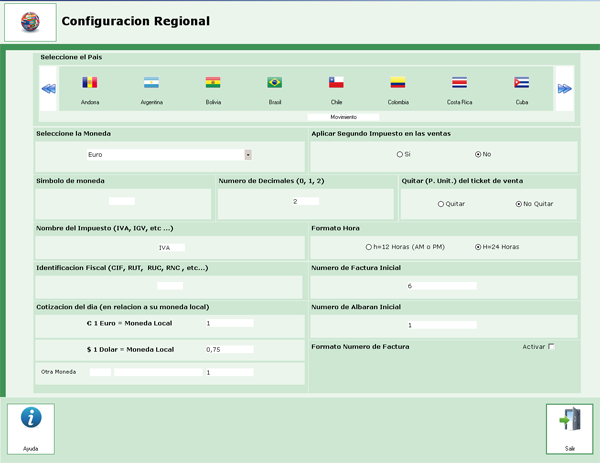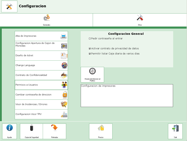Permite, entre otras, modificar la configuración regional, el ticket de venta, el número de decimales y todo lo relacionado con el programa.