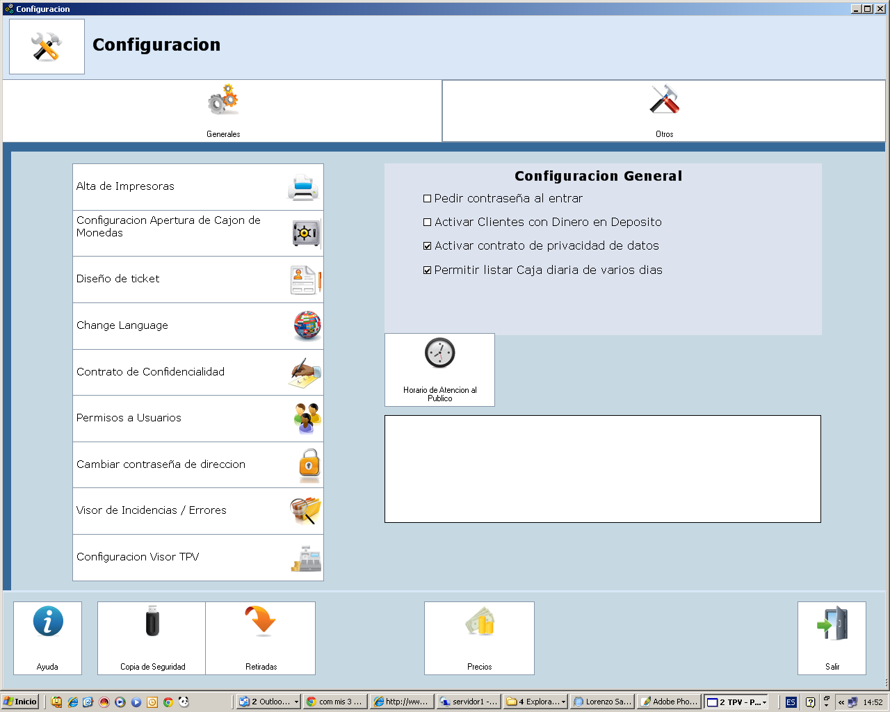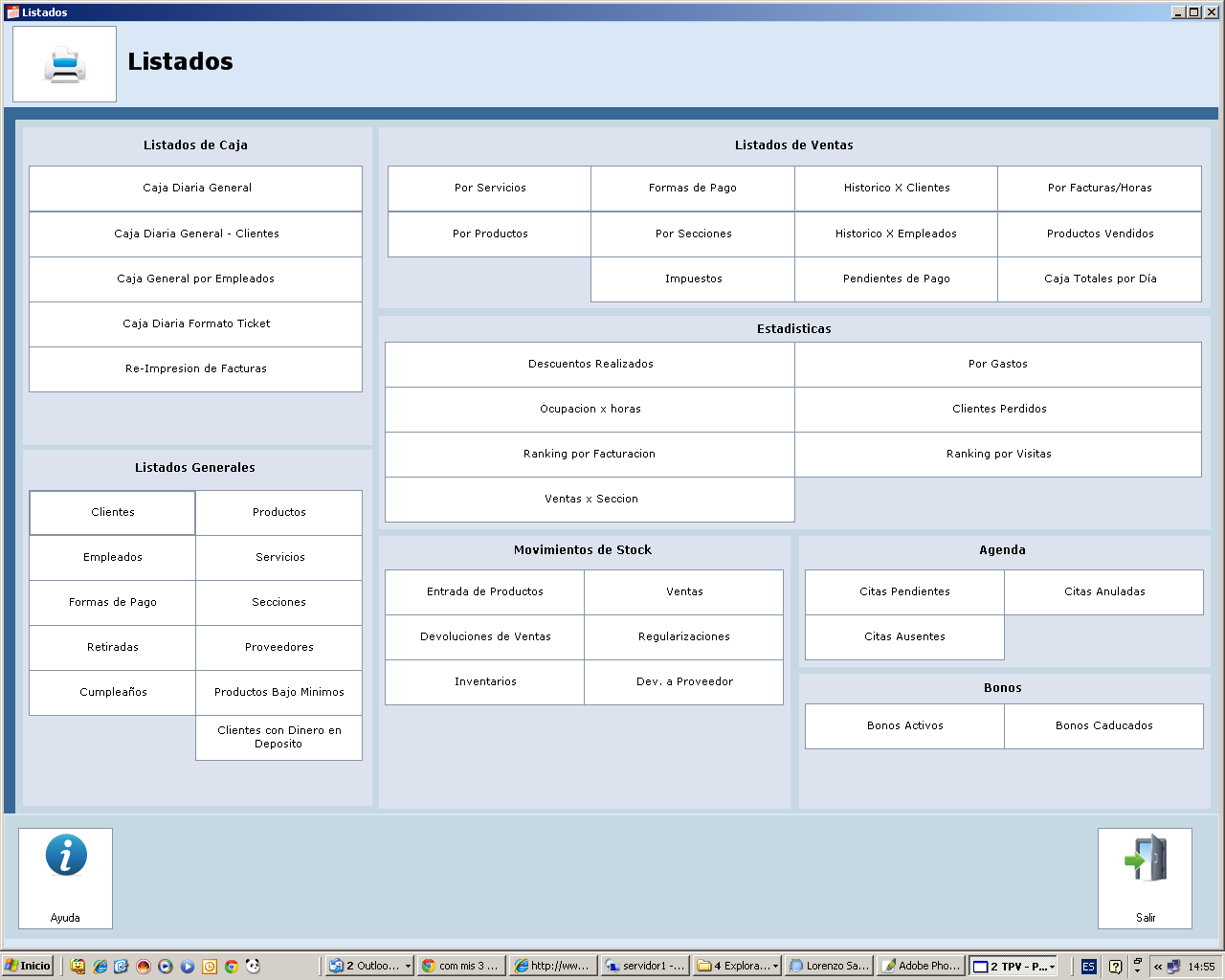 Apartados en los que dividimos nuestro centro: Peluquería – Estética - Rayos, etc., para trabajar desde la pantalla táctil y poder ver listados de cada una de las secciones, etc.