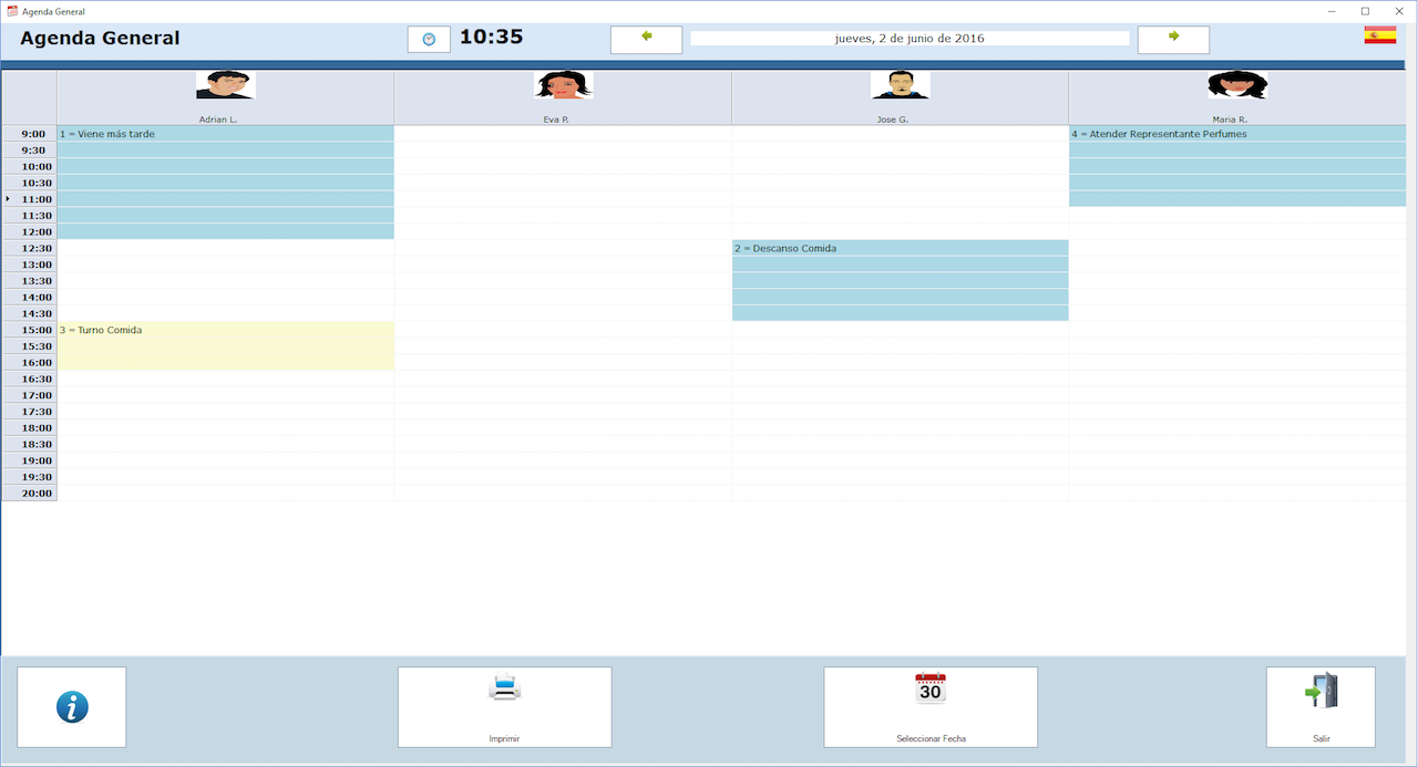 Gestiona tus empleados y sus comisiones. Permite seleccionar si aparecen en agenda, cobrar en caja, etc. Asigna permisos a qué partes del programa puede tener acceso.