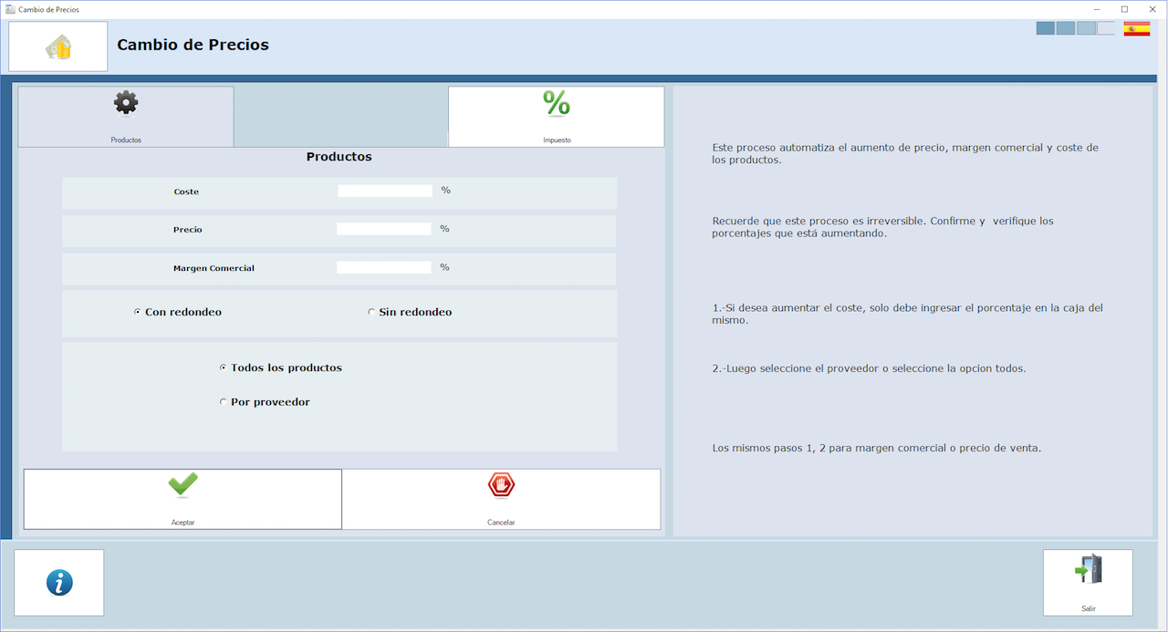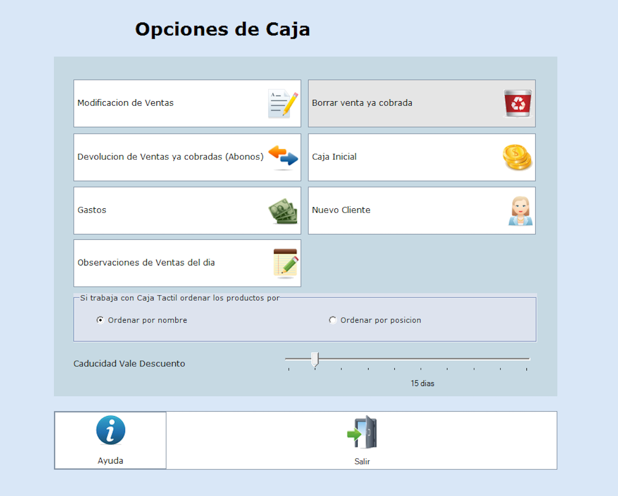 Permite, entre otras, modificar la configuración regional, el ticket de venta, el número de decimales y todo lo relacionado con el programa.