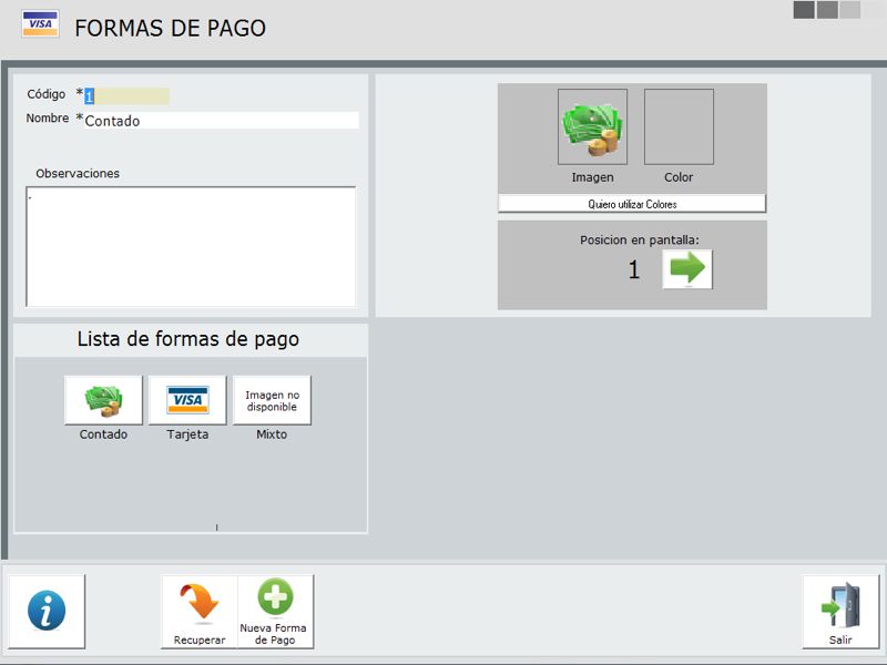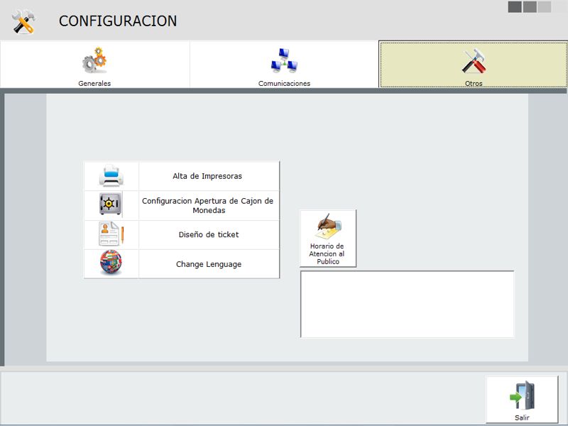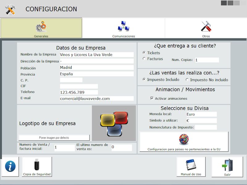 Permite, entre otras, modificar la configuración regional, el ticket de venta, el número de decimales y todo lo relacionado con el programa.
