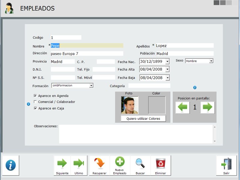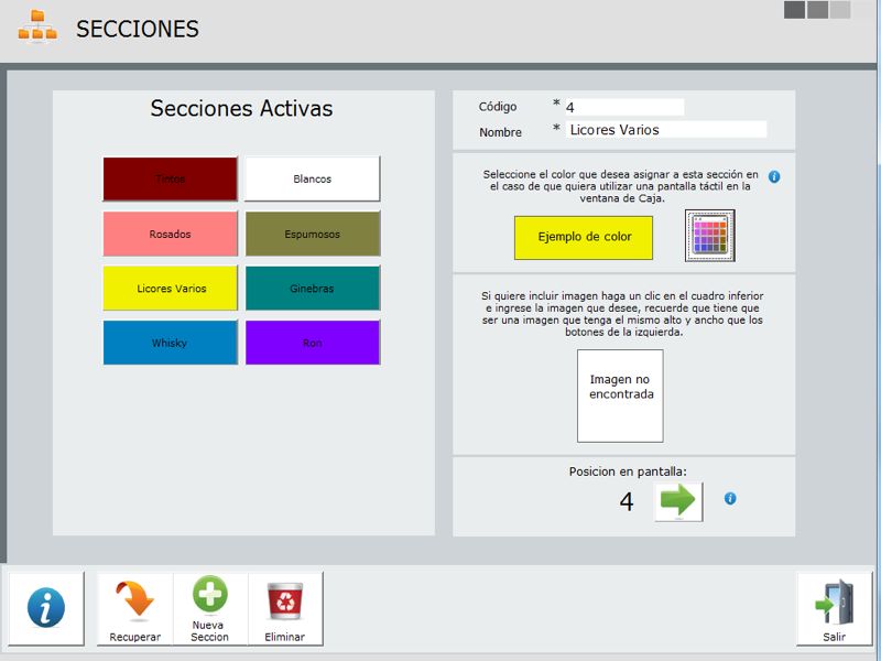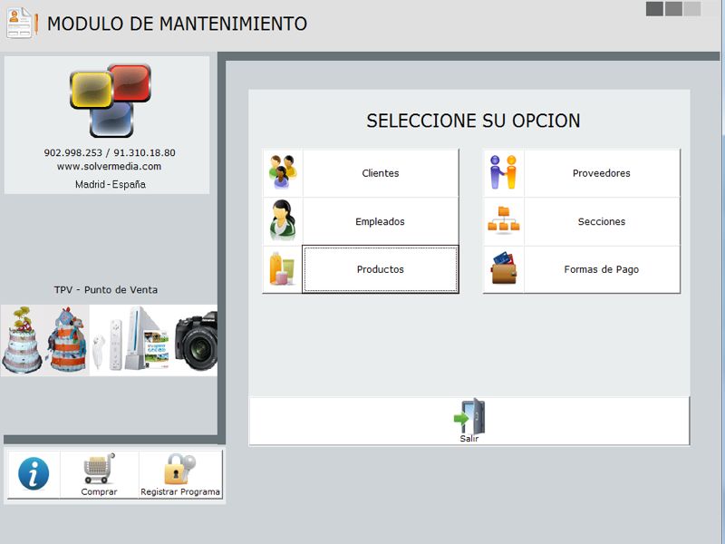 Creación, modificación, consulta y eliminación de secciones, proveedores, productos, clientes, formas de pago, empleados, etc.